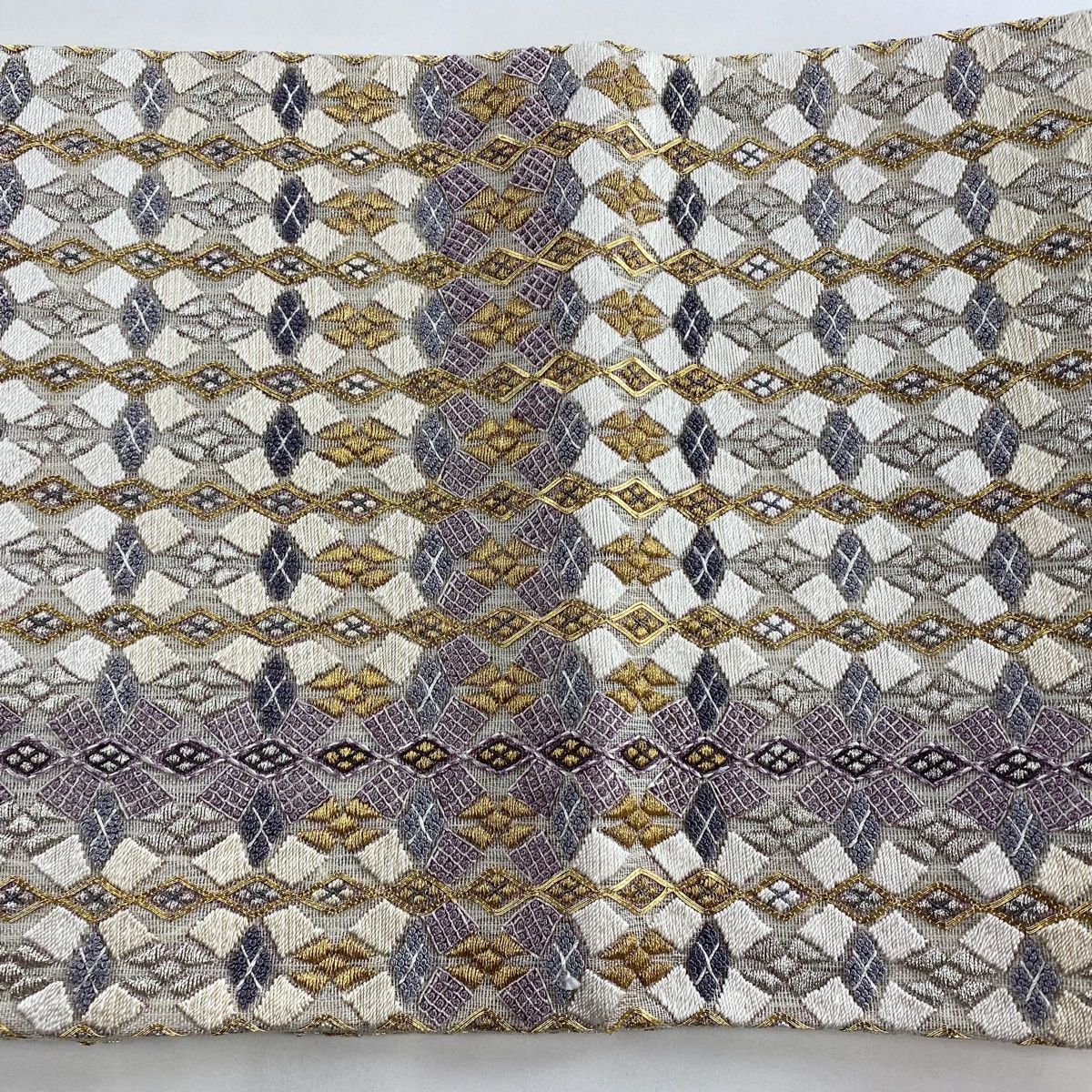 袋帯 菱 幾何学 金銀糸 刺繍 クリーム 六通 正絹