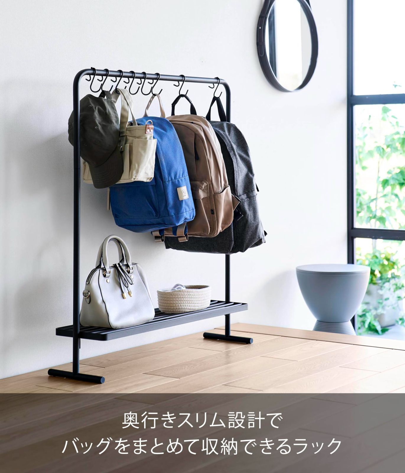奥行きスリム設計で、バッグをすっきりまとめて収納できるラックです。