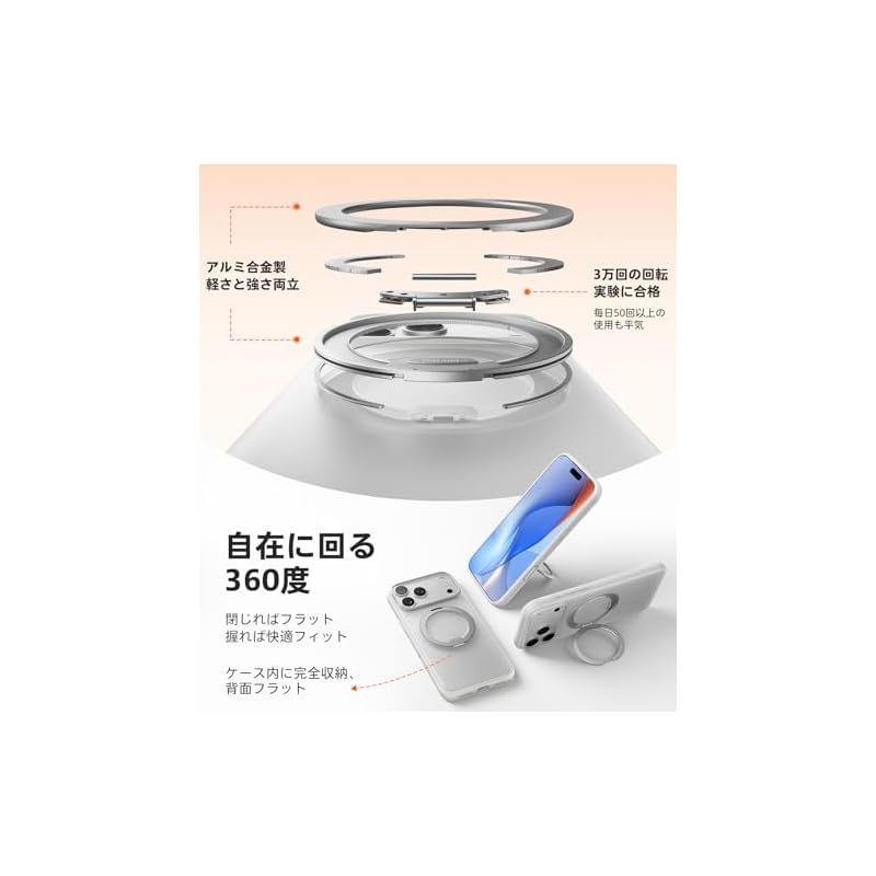 【 自由自在の360°回転スタンド】360°回転可能な支架を搭載し、いつでも自由に角度調整が可能。新設計の滑らかな阻尼感と心地よいカチカチ音で、開閉するたびにリラックス感と楽しさを実感できます。撮影、動画視聴、日常の記録など、あらゆるシーンで、お好みの角度に自由に調整してしっかり固定でき、手を解放して快適に操作が楽しめます。対応機種:For iPhone 17 pro max ケース