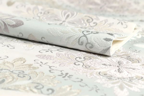 全体には、銀糸、白色、ごく薄い紫などのお色目で、菱形の花模様が織り上げられております。