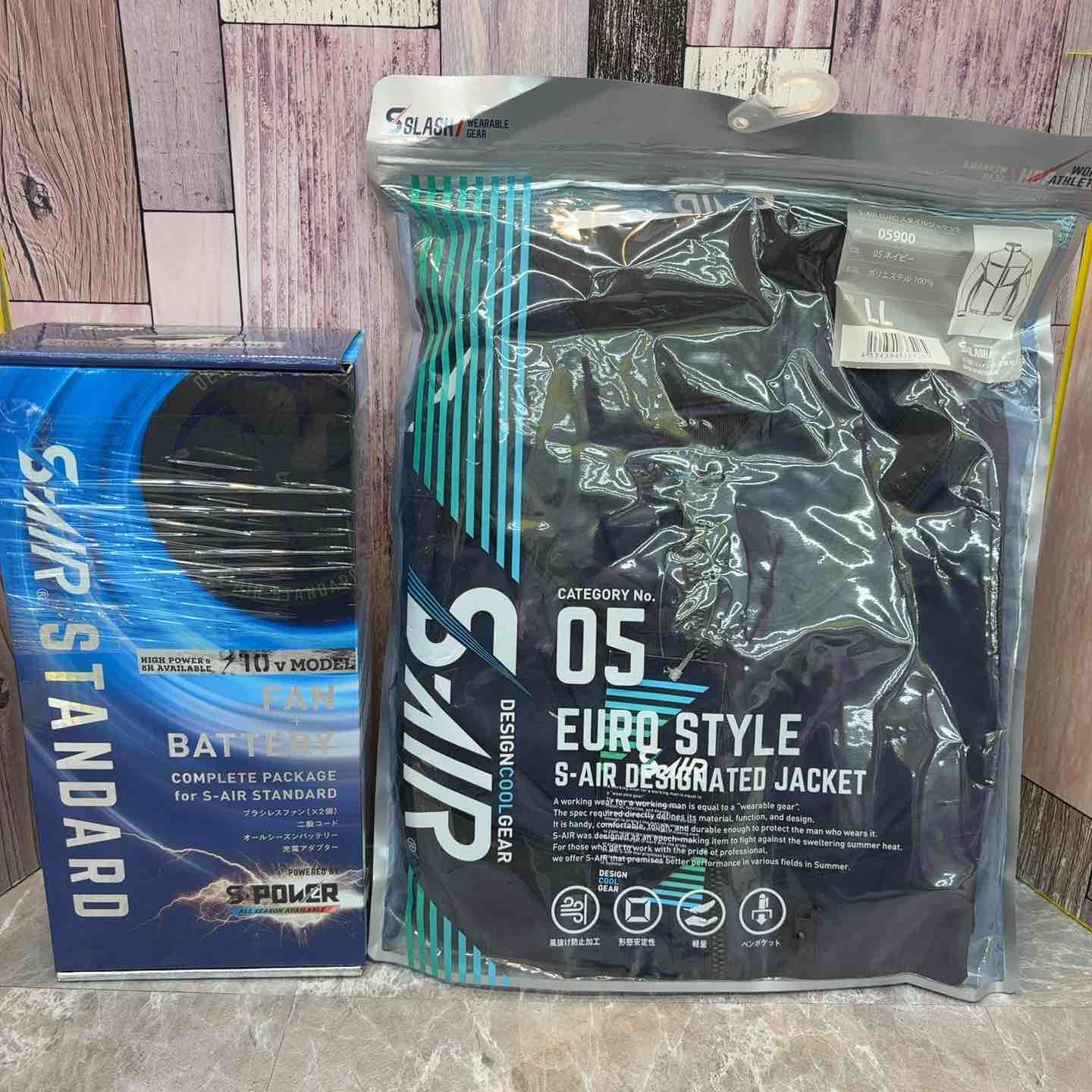 【シンメン S-AIR ファンバッテリーフルセット SA-10】と【シンメン S-AIR EURO スタイルジャケット LLサイズ ネイビー】のセットです。