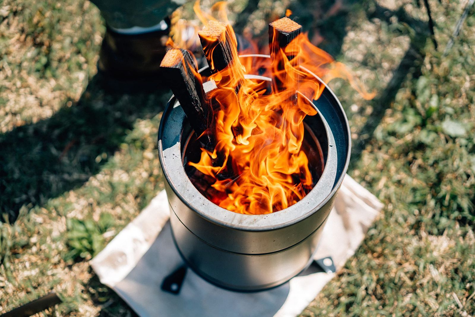 煙突効果で抜群の燃焼効率。カバ-を付けると二次燃焼。五徳付き。高火力を利用して調理可能。吊るして焚火が出来る。※市販のSカンチェ-ンをご利用ください。。脚にペグを打ち込んで転倒防止。