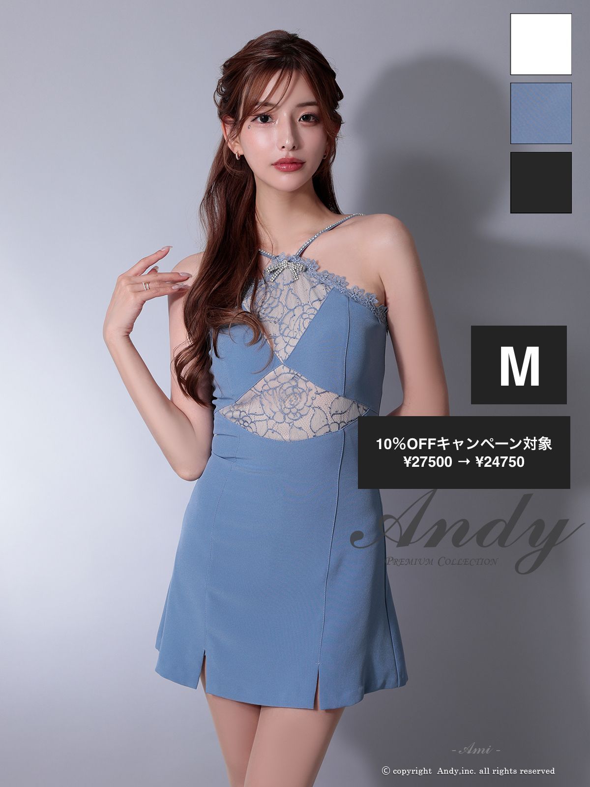 Mブルー OK 2961-W-2507 XSサイズあり ANDY|アンディ ビジューリボン| ホルターネック| レース| 切替| ストレッチ| フ | ミニドレス| キャバドレス
