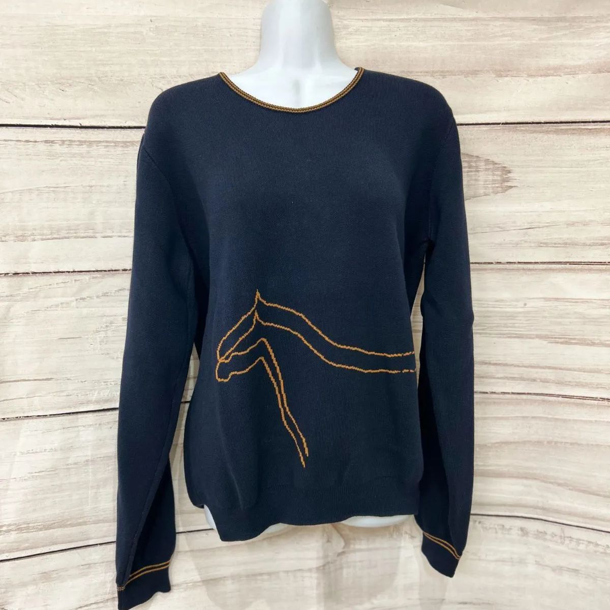 上質な重厚感あるコットンセーターです。襟、袖口にあるブラウンオレンジカラーのラインがアクセントに。丸首カットが女性らしい優しい雰囲気に。フロントに大きな馬のシルエット柄が入っています。肌触りが良く、普段着にもオススメです。