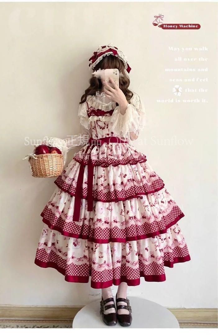 赤チェリー ロリータスカート jsk 春夏ロングワンピース 日常田園風