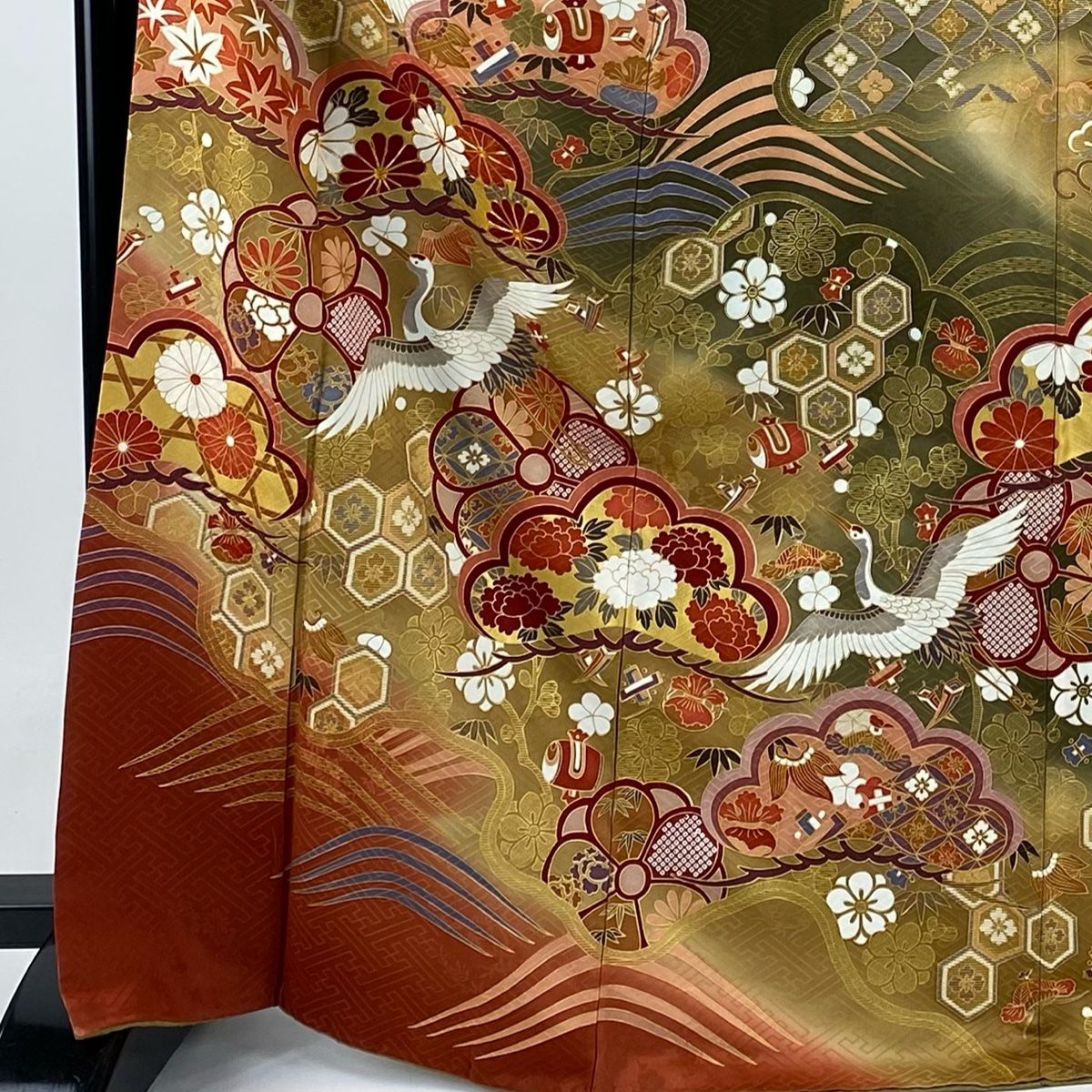 振袖 身丈169 cm 裄丈66 M 袷 松竹梅 鶴 金糸 金彩 茶緑色 正絹 秀品