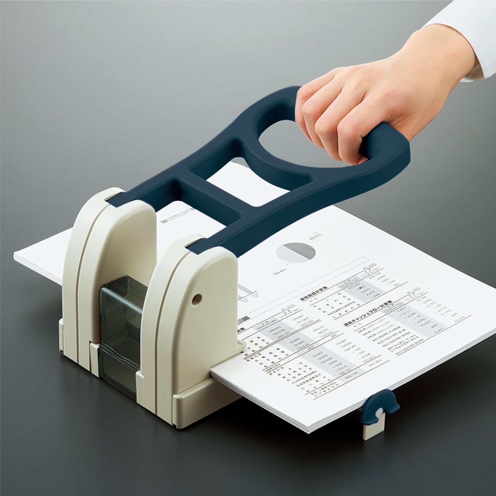 ●軽い力で穴あけできるユニバーサルデザインの強力パンチです。