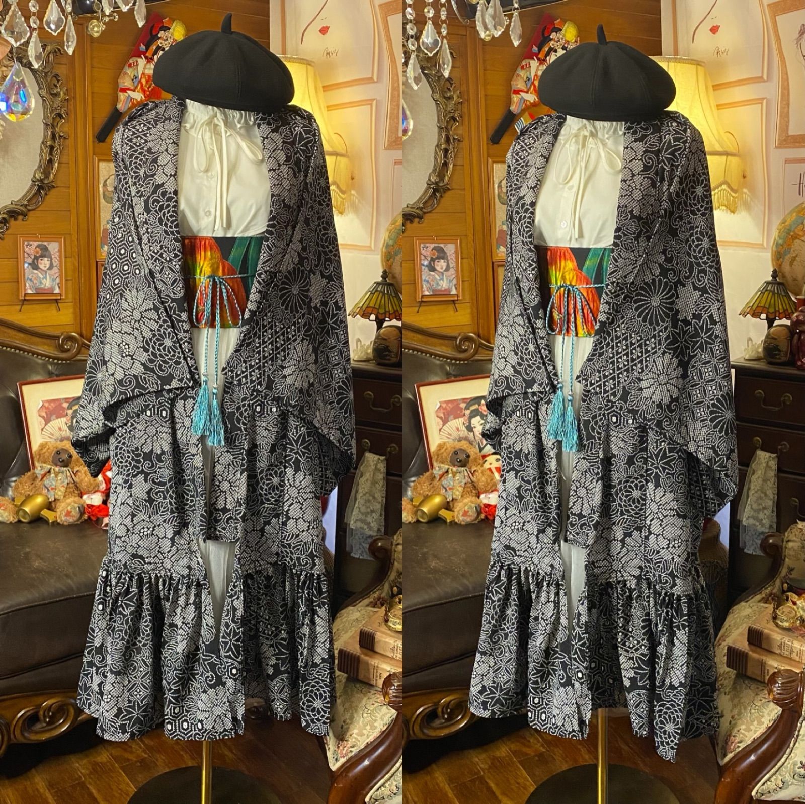 単衣着物 2 way ガウン 羽織り ドレス ワンピース ハンドメイド 和洋折衷 洗える 化繊 リメイク 名古屋帯サッシュベルト レトロ 古着 墨黒 黒地と絞り風 KD-64