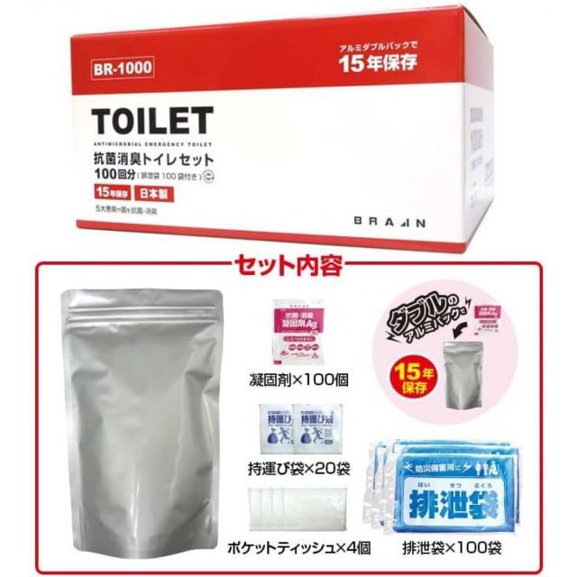 BRAIN ブレイン 防災グッズ 抗菌非常用トイレセット 100回分 排泄袋付 BR 1000 非常用 トイレ 凝固 避難 被災 防災 対策 断水