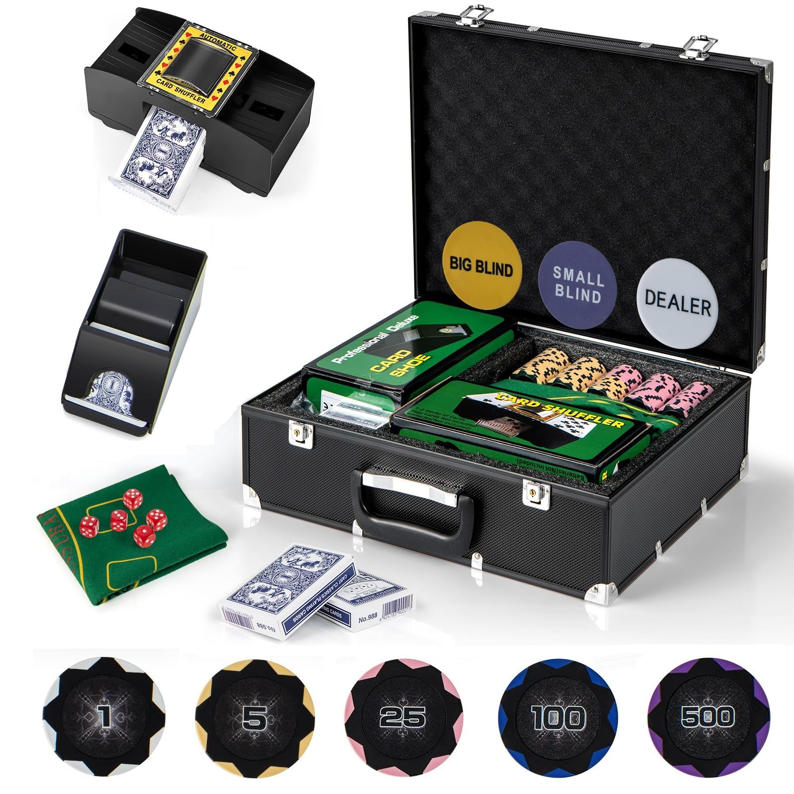 *セット内容:チップx300枚;ケース/ブラックx1個;マットx1枚;カードシューx1個;カードシャッフラーx1個;サイコロx5個;トランプx2組;ディーラーx3個;鍵x2本。