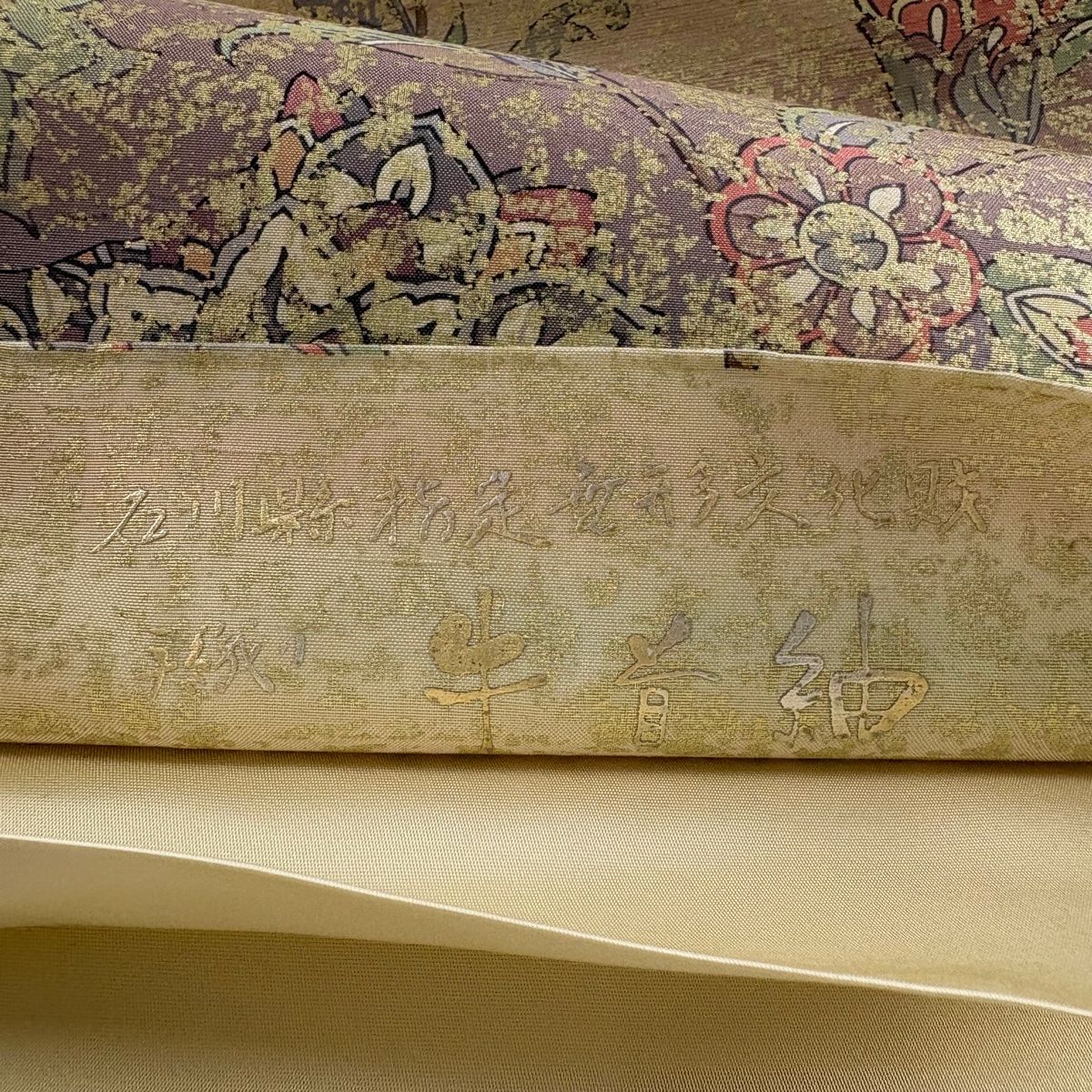 袋帯 落款 牛首紬地 華文 枝花 金彩 ベージュ お太鼓柄 正絹