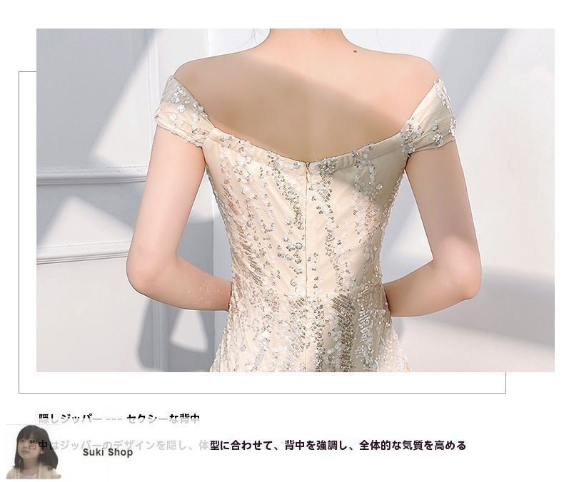 新しい♥ シャンパンカラー レディースドレス 感 気品あふれる 絶美 司会者向け 一字肩 マーメイドライン スパンコール ロングドレス